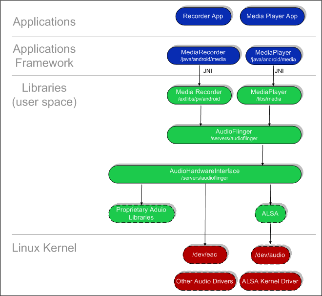 To implement an audio driver, create a shared library that implements the interface defined in AudioHardwareInterface.h. You must name your shared library libaudio.so so that it will get loaded from /system/lib at runtime. Place libaudio sources and Android.mk in vendor/acme/chipset_or_board/libaudio/.