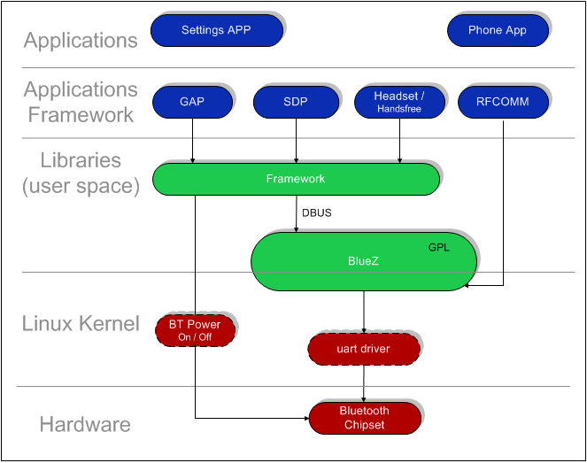 Bluez is GPL licensed, so the Android framework interacts with userspace bluez code through D-BUS IPC to avoid proprietary code.